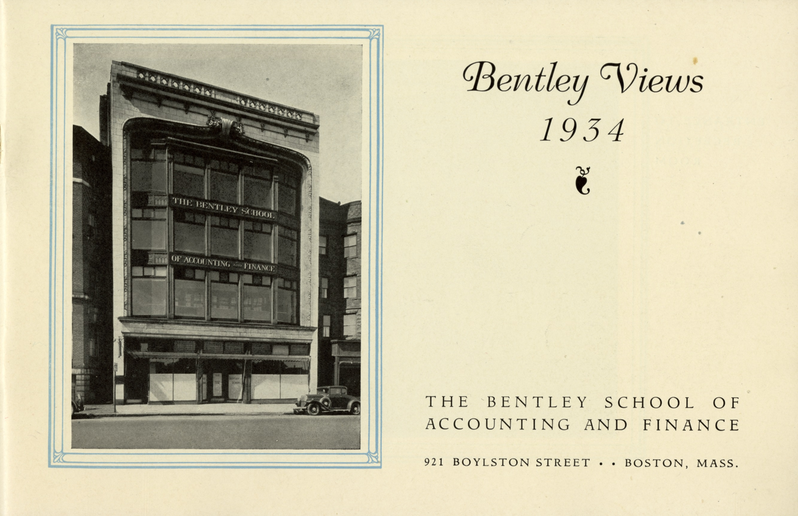 If you’re a Bentley student or alum, you are probably familiar with all the great flyers, booklets, and maybe even websites that help you to learn about the Bentley experience. This gallery gives you a glimpse at what those resources looked like in Bentley’s (very) early days! “Bentley Views” was a publication released annually to show off Bentley’s downtown Boston amenities and introduce faculty and staff. We’ll be taking a closer look at some of those Bentley leaders in an upcoming exhibit, so for now flip through these great photos that show you what life would have been like if you were at Bentley in 1934!