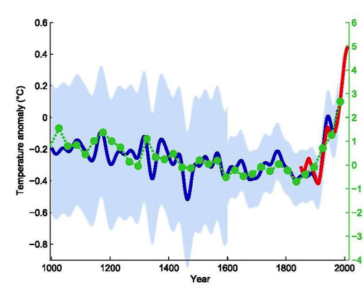 Despite challenges to its underlying data and methodology by climate change skeptics, the hockey stick graph first published by Mann and his colleagues has been successfully, independently reconstructed by peer-reviewed researchers dozens of times. The long gradual decline in global temperature represents part of a natural climate cycle that has been extended back 12,000 years, and would have led us slowly into the next Ice Age had not humans intervened by loading the atmosphere with carbon (greenhouse gases) by burning fossil fuels. The hockey stick remains the leading visual representation of the rapid acceleration of global mean temperatures in the 20th century and a stark reminder of the challenges facing the planet as a result.