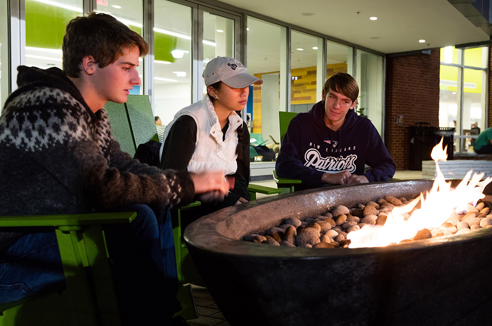 Housed in the new addition on the first floor, the Living Room has tables and comfy chairs suited for studying or hanging out. Pool and ping pong tables are big draws. There are five glass-enclosed study rooms, along with a NanaWall with removable glass panels, which opens up to the center’s outdoor patio. A double-sided indoor fireplace looks in to the Café.