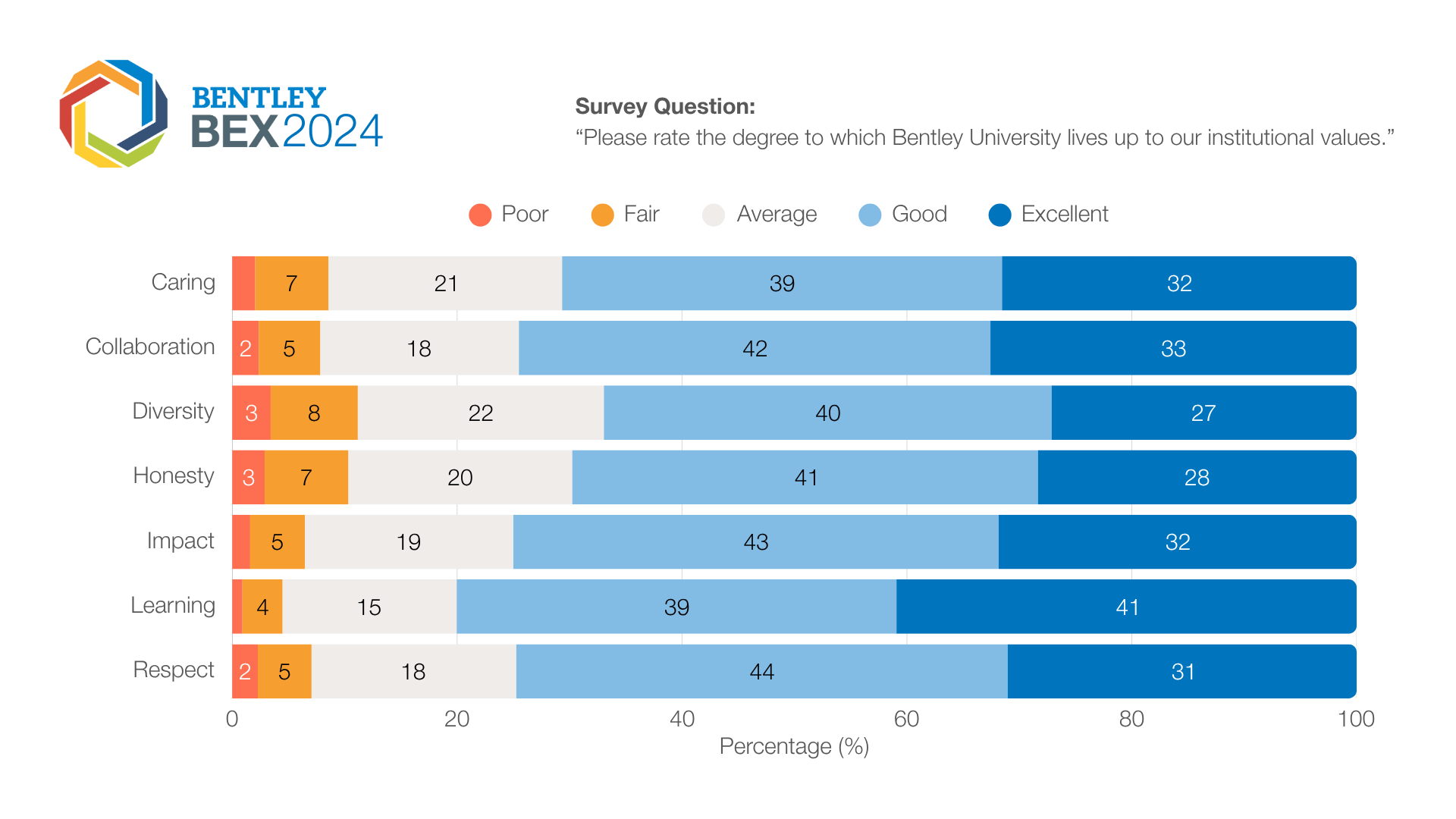 Below is a small gallery that shows graphs detailing how the Bentley community rated our commitment to our values. More descriptive data can be found in the BEX 2024 Results Document.